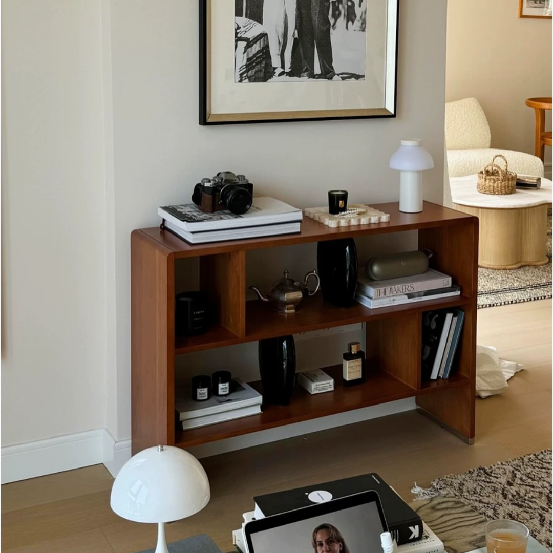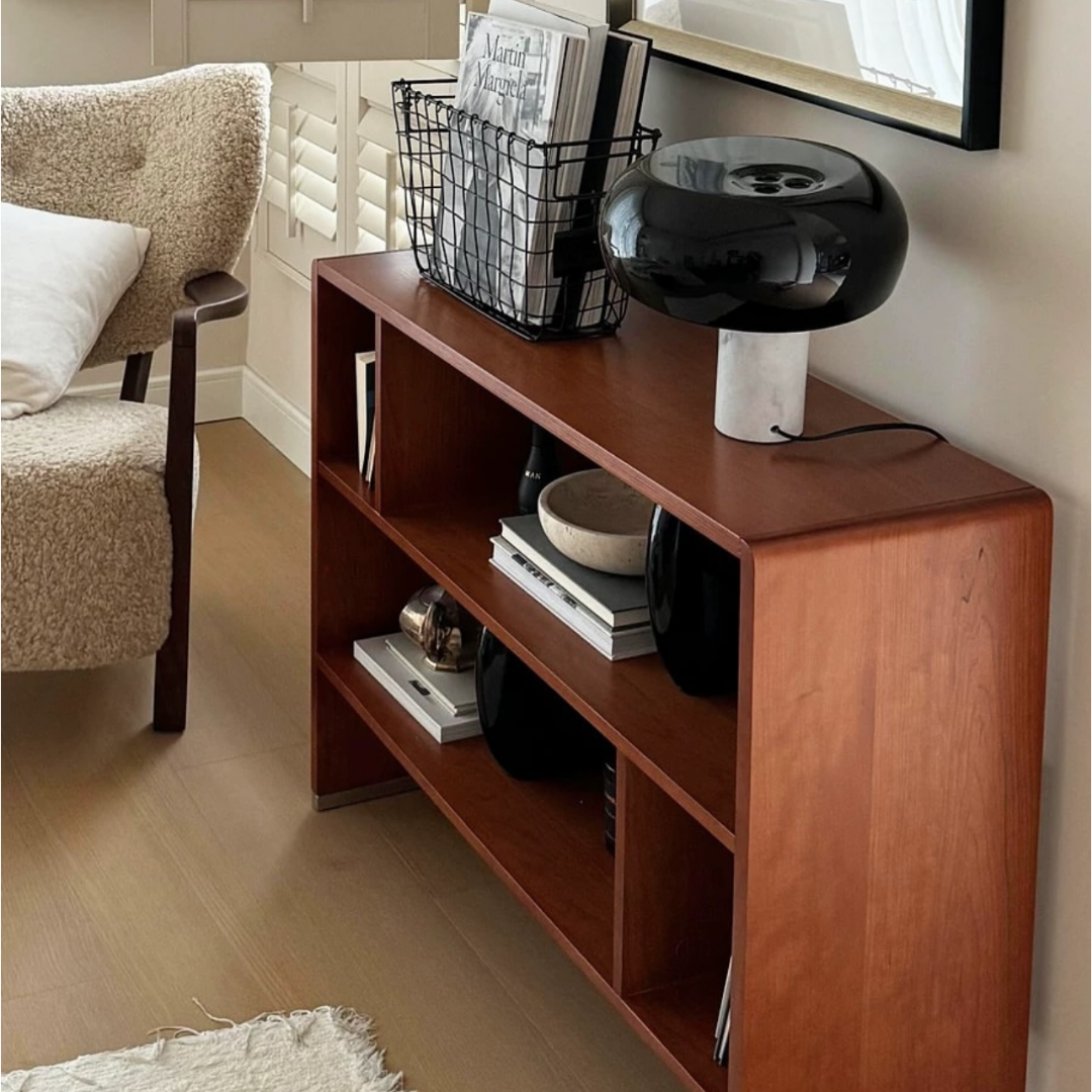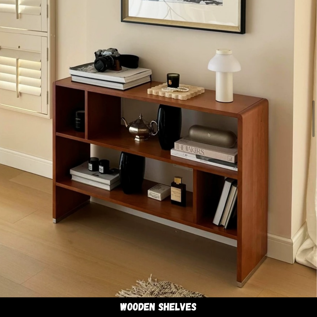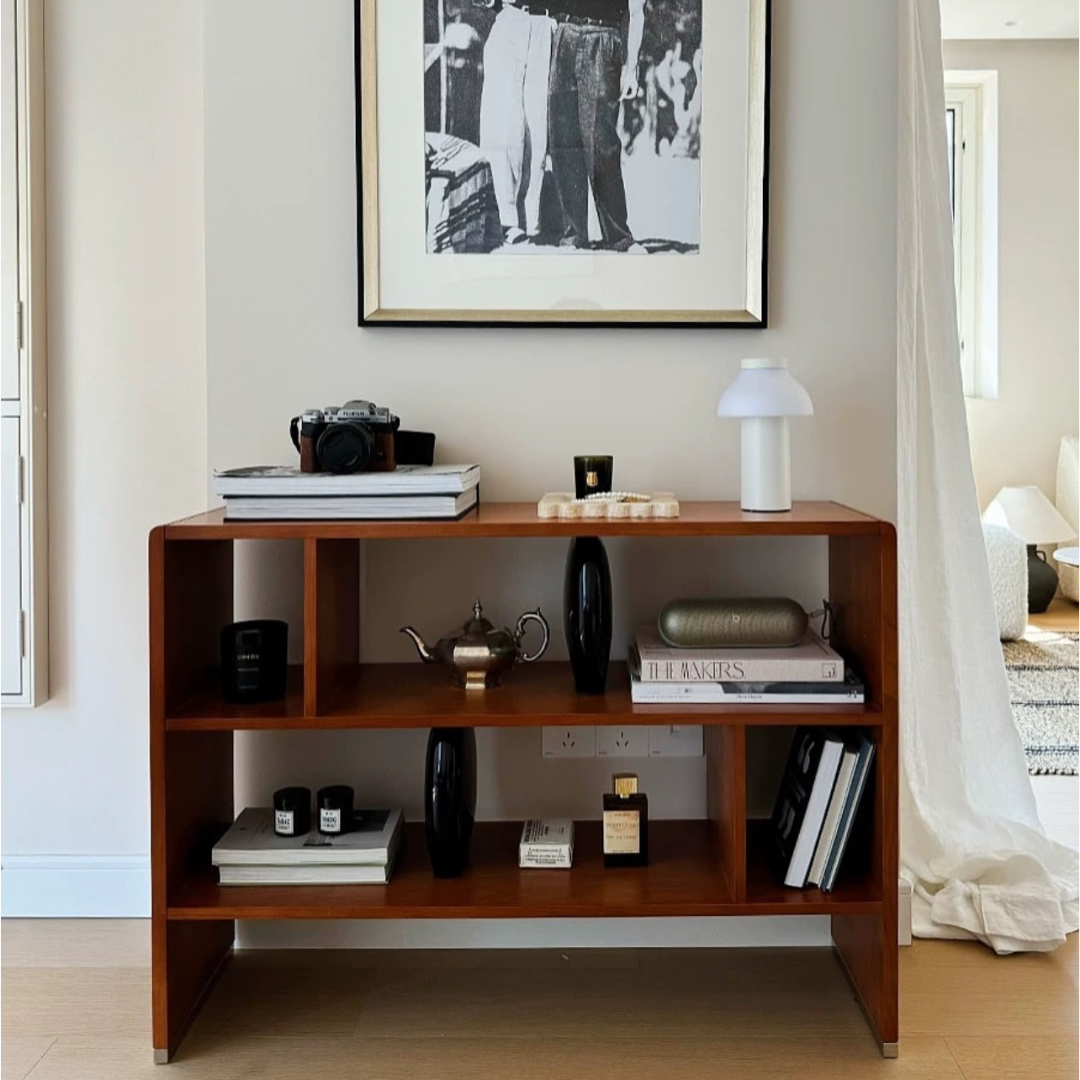 ชั้นเก็บของ CB0311 wooden console table or display shelf, crafted from solid wood with a sturdy structure. Thoughtfully designed with well-divided compartments for functional and aesthetic balance. Beautiful and refined in every detail.