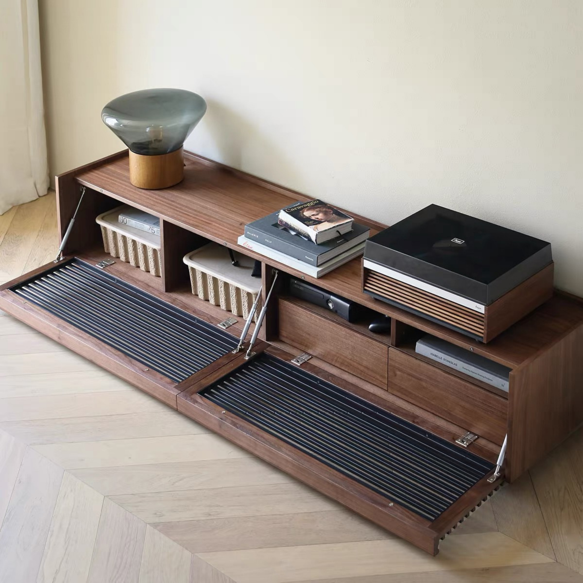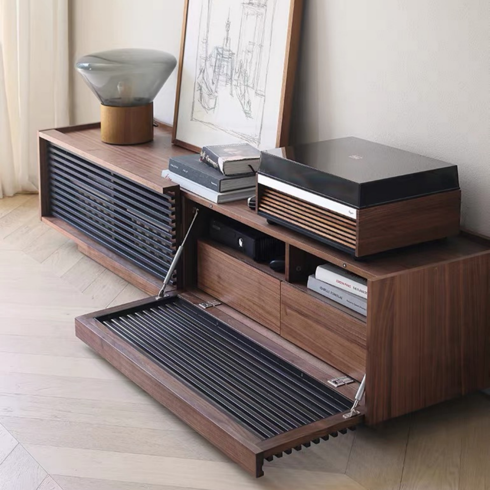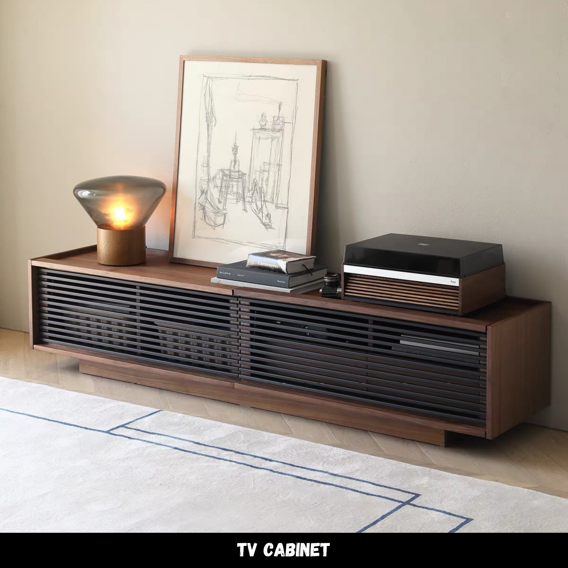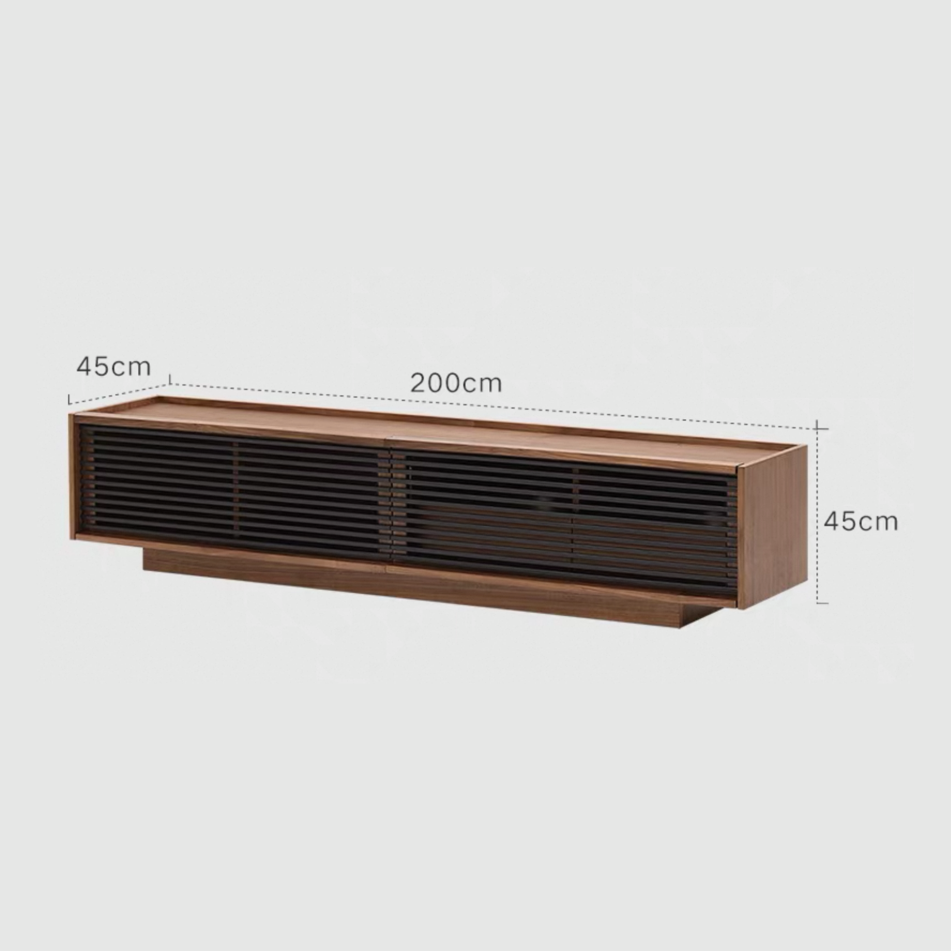 ตู้วางทีวี ( TB335 ) crafted from premium Black Walnut wood. Timeless design with strength, elegance, and natural warmth. Featuring ventilated slatted doors and versatile storage space. Meticulously designed to balance beauty and functionality ( สินค้ามี 3 size 180 , 200 , 220 cm )