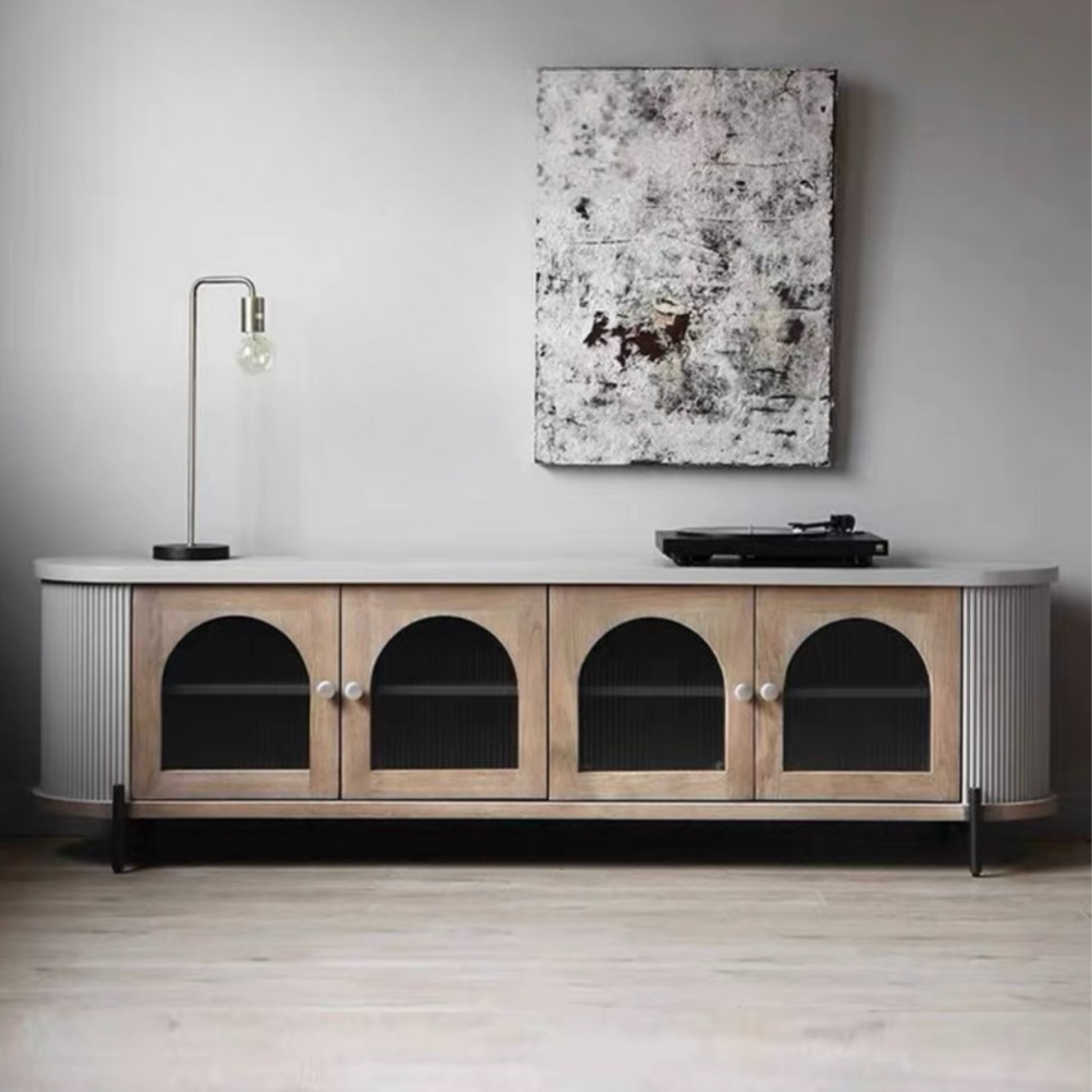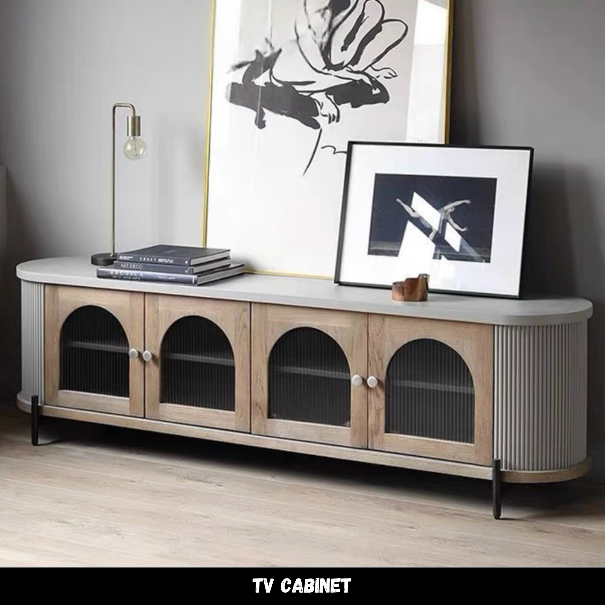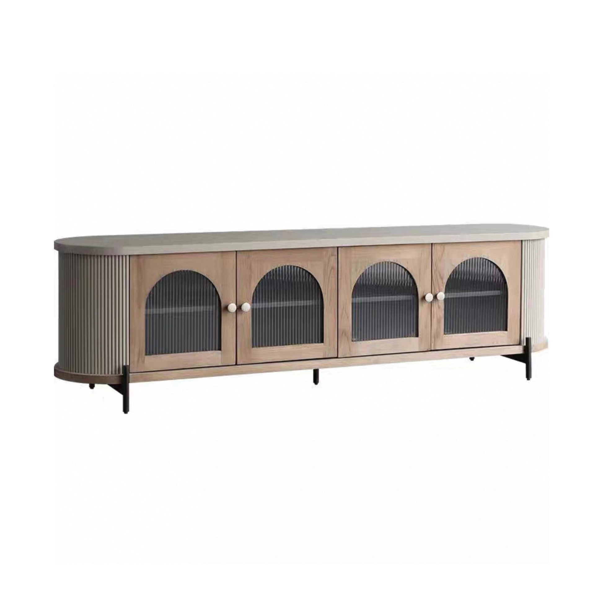 ตู้วางทีวี ( TB3479 ) A contemporary TV cabinet with distinctive arched ribbed glass doors. Natural wood tones bring warmth and refined elegance to any space. Ample storage capacity designed for modern living. Perfectly balancing functionality with timeless style.
