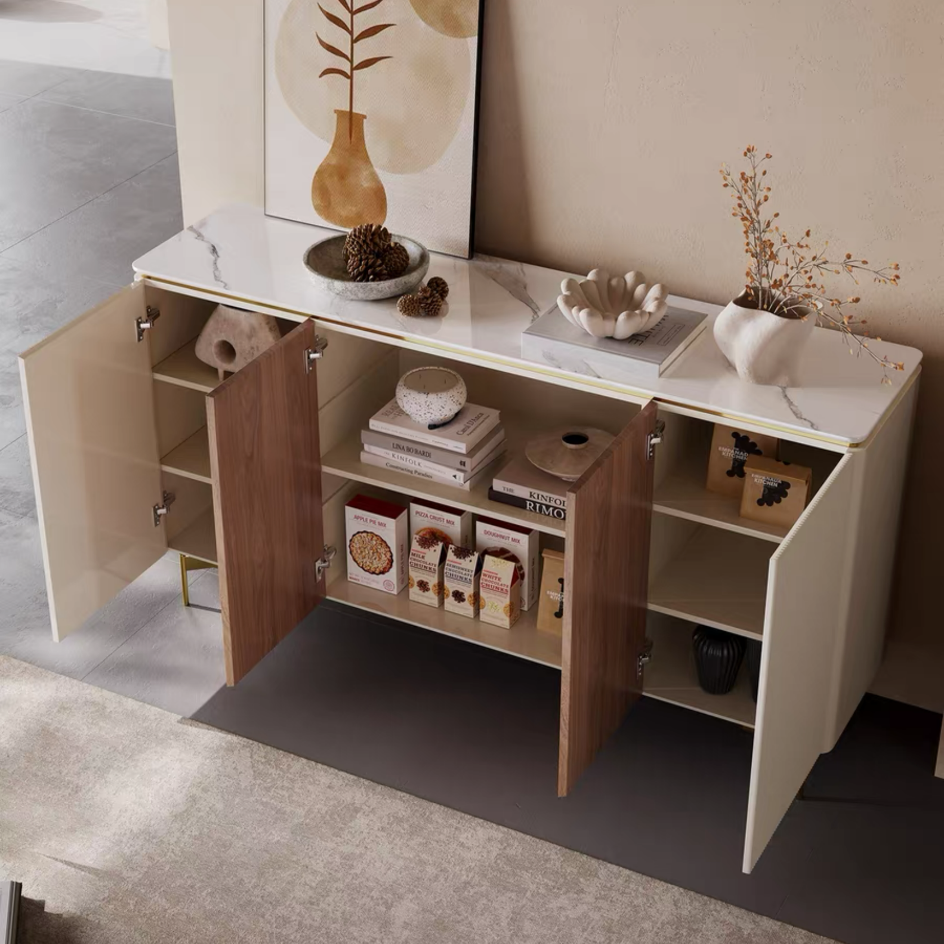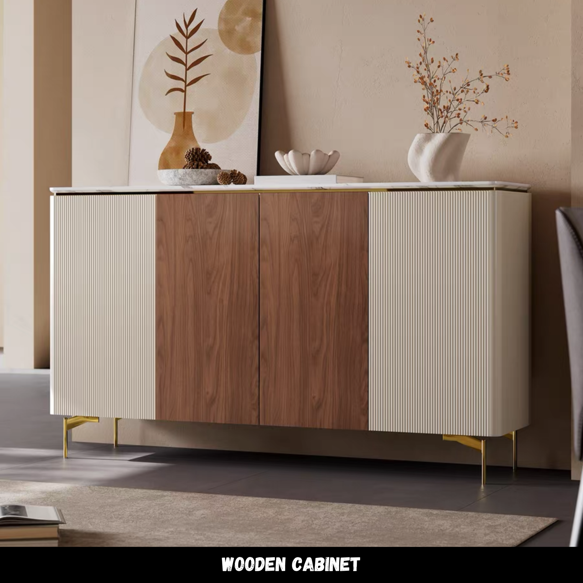 ตู้เก็บของ รุ่น CB0125 contemporary cabinet blending elegance with natural warmth. Wood veneer doors paired with soft cream panels for refined contrast. Polished brass legs add a touch of timeless luxury 🚛 มีบริการประกอบสินค้าให้ 🛠