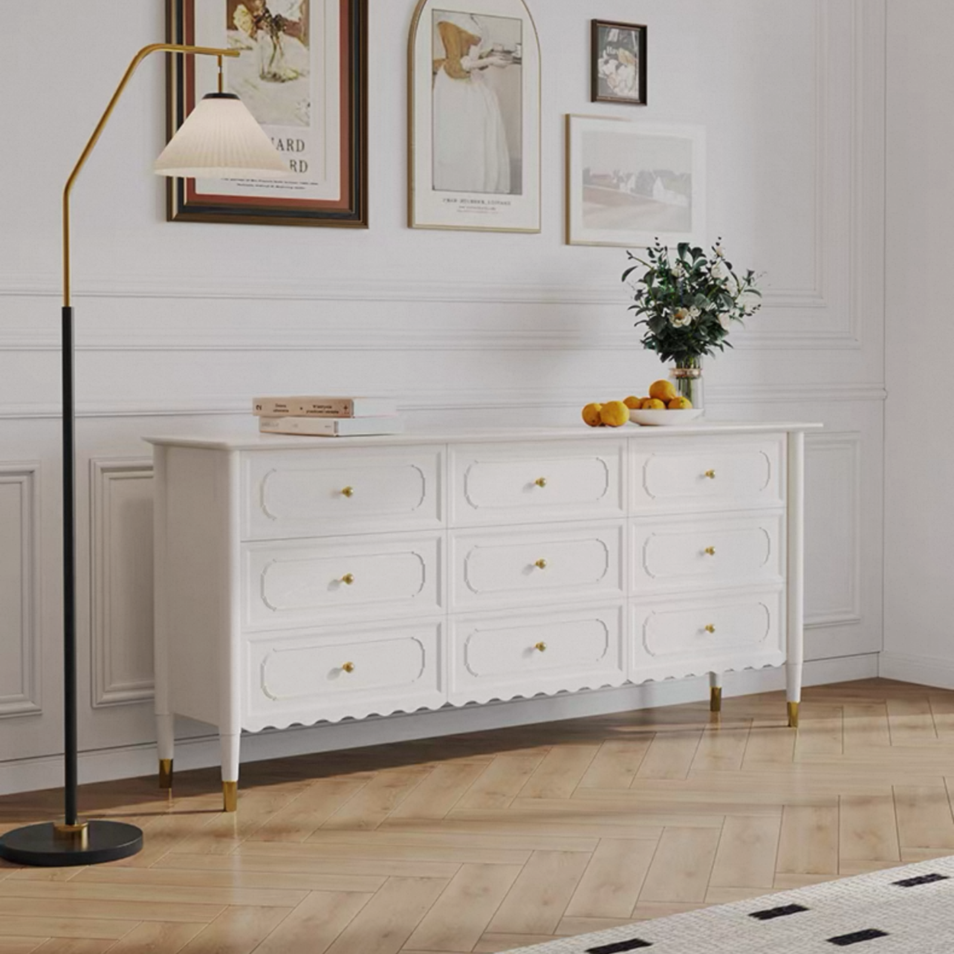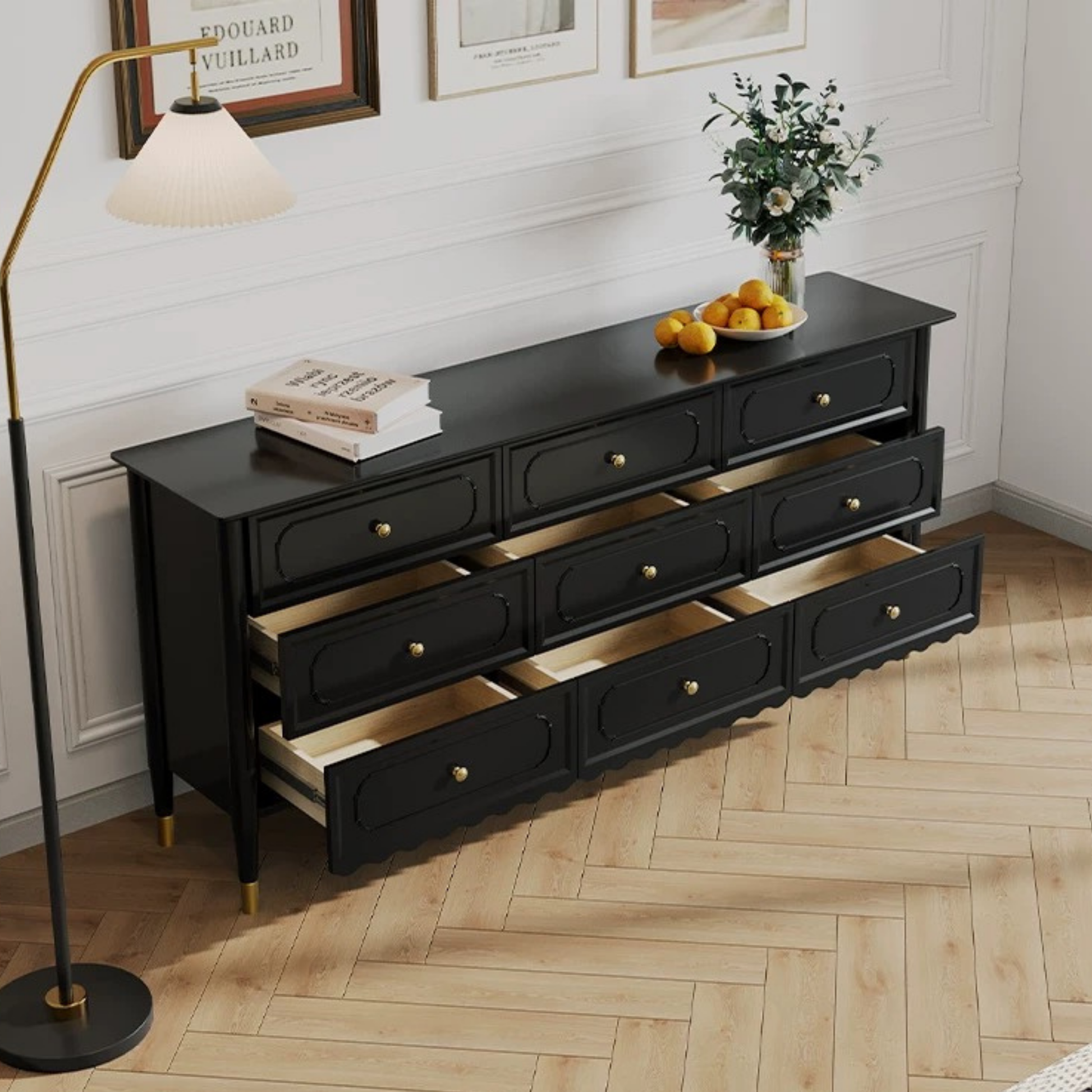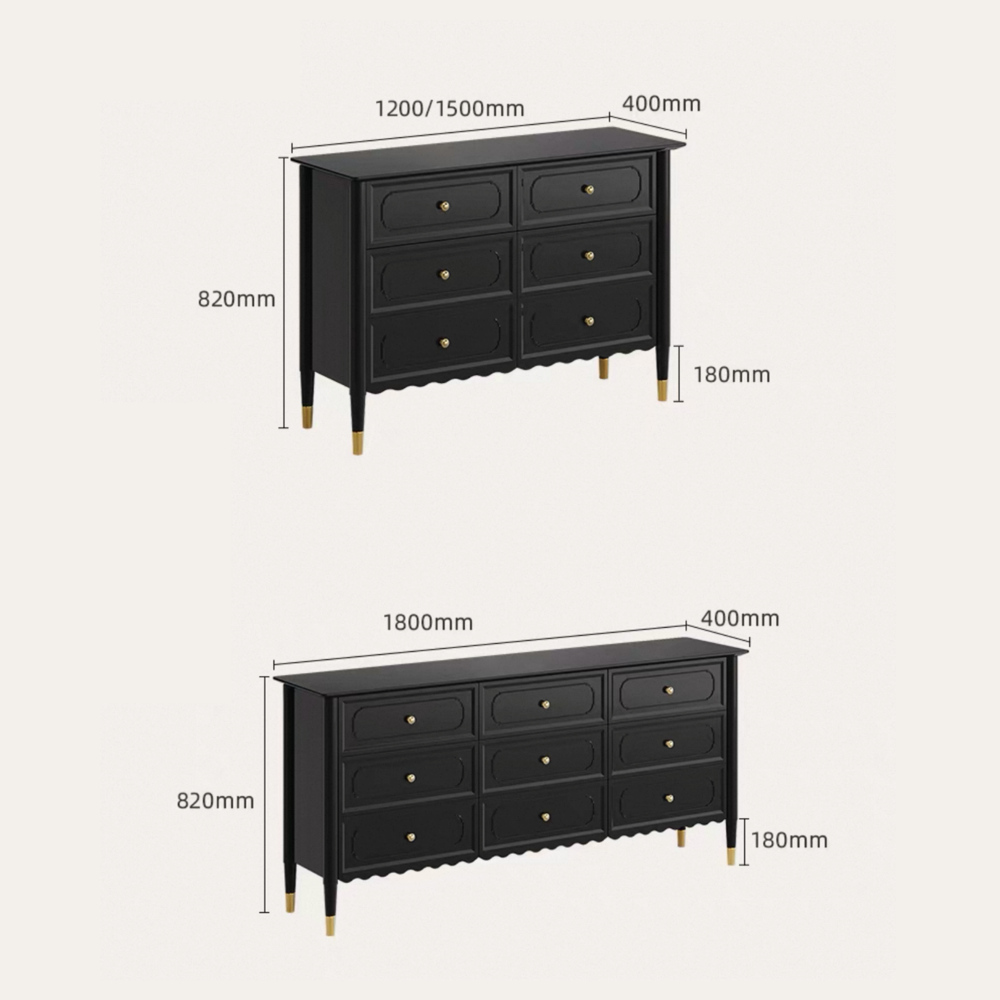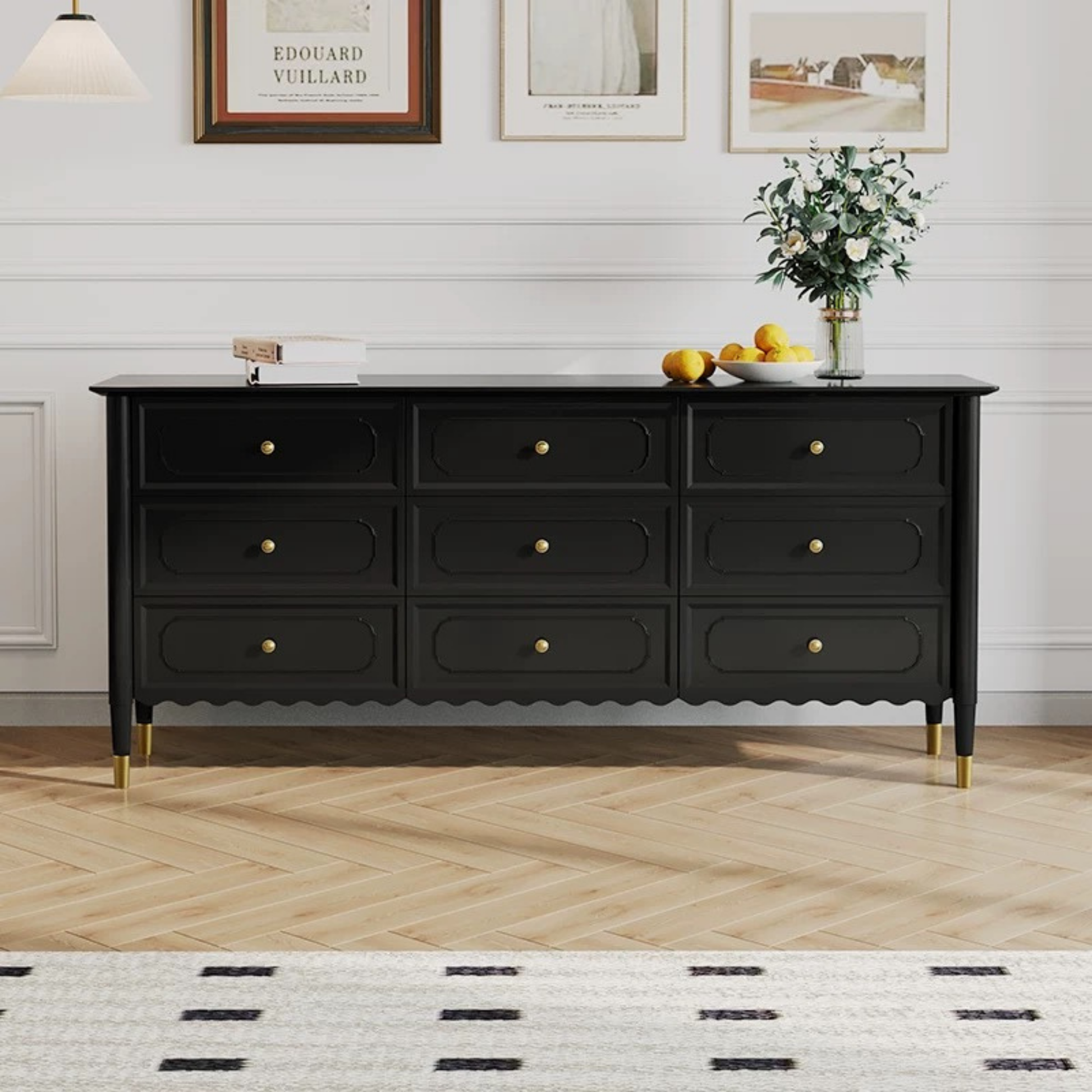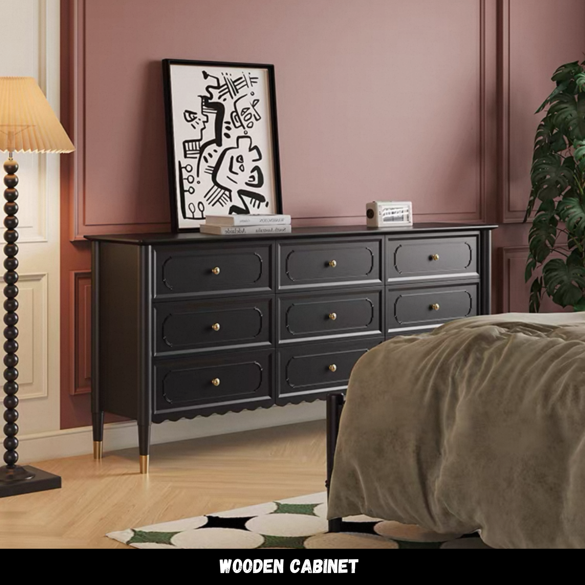 ตู้เก็บของ รุ่น CB0406 Elegant matte black dresser featuring 9 spacious drawers with refined gold-tone knobs and scalloped base detailing. Accented with tapered legs and golden foot caps, this piece brings timeless charm and sophistication to any living room, bedroom, or hallway. ( สินค้ามี 3 size 120 , 150 , 180 cm ) 🚛 มีบริการประกอบสินค้าให้ 🛠