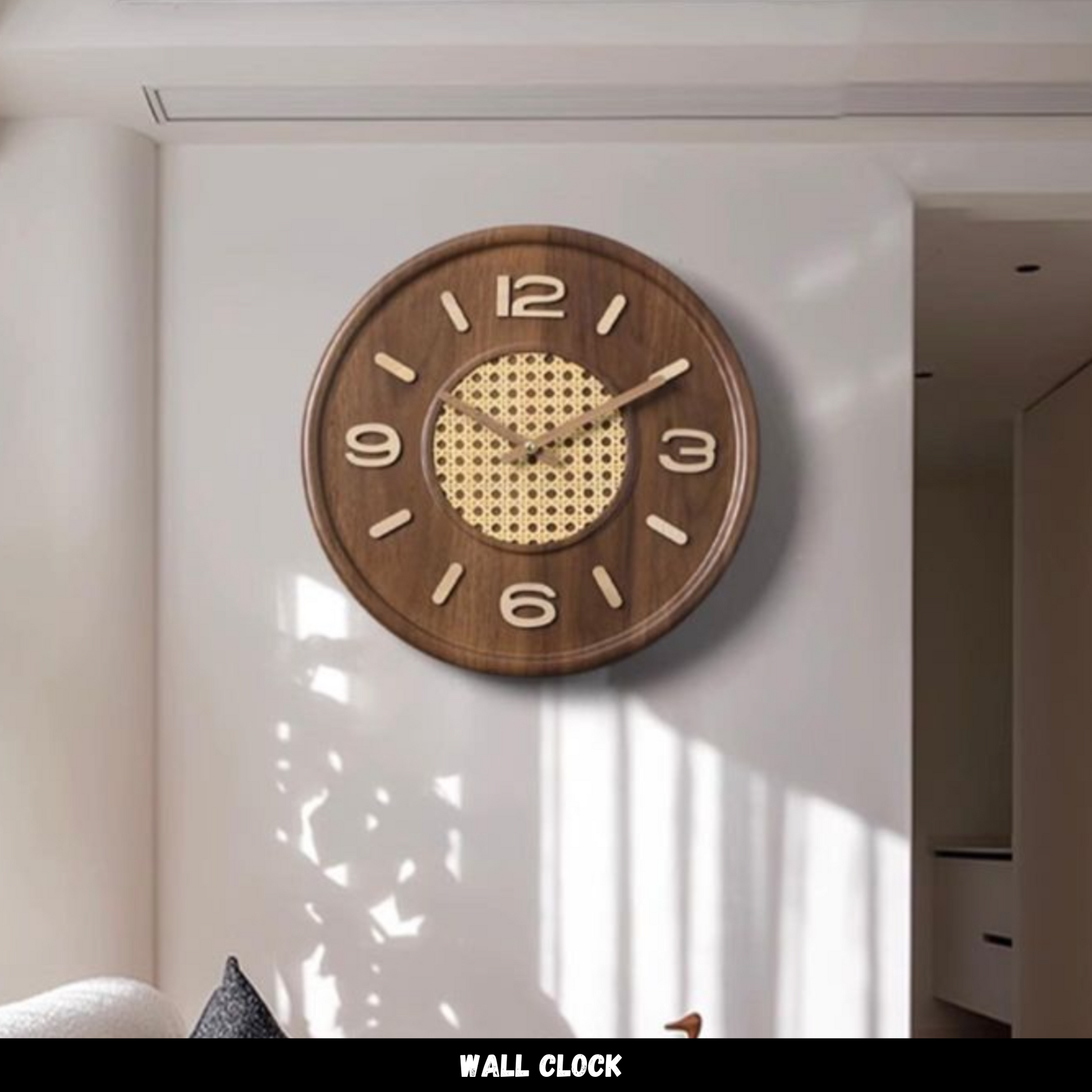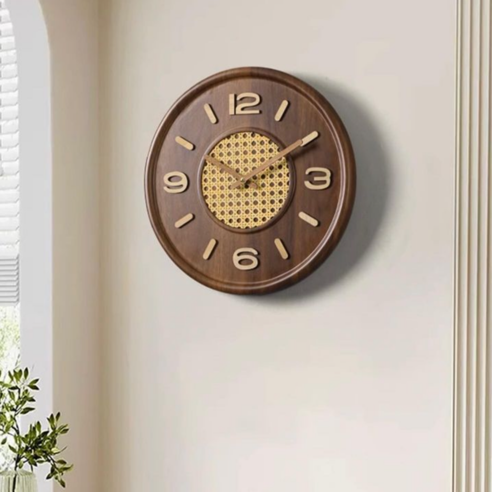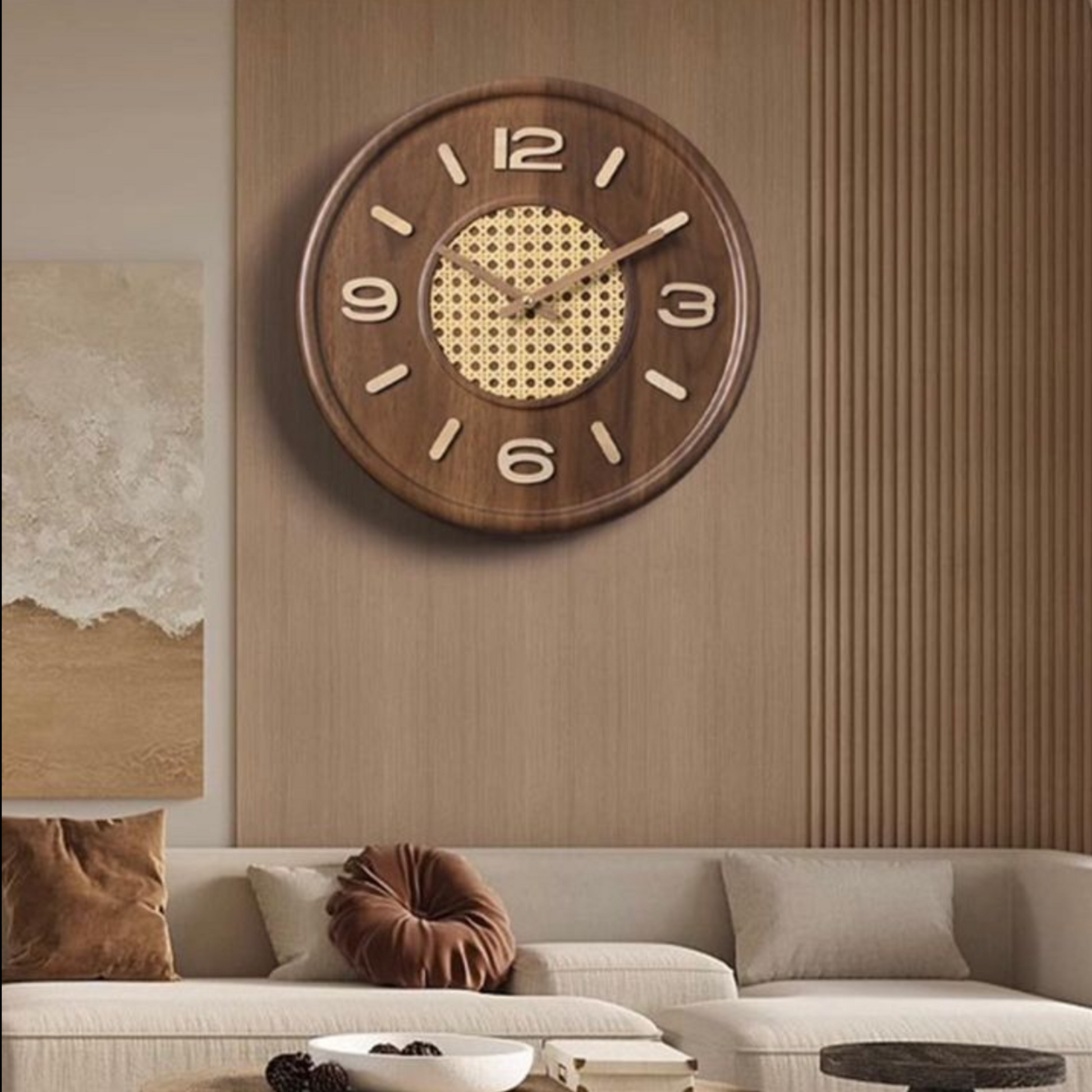 นาฬิกาไม้ติดผนัง DS121 ทรงกลม วัสดุเนื้อไม้ ตกแต่งด้วยหวายภายใน นาฬิการเดินเสียงเงียบ