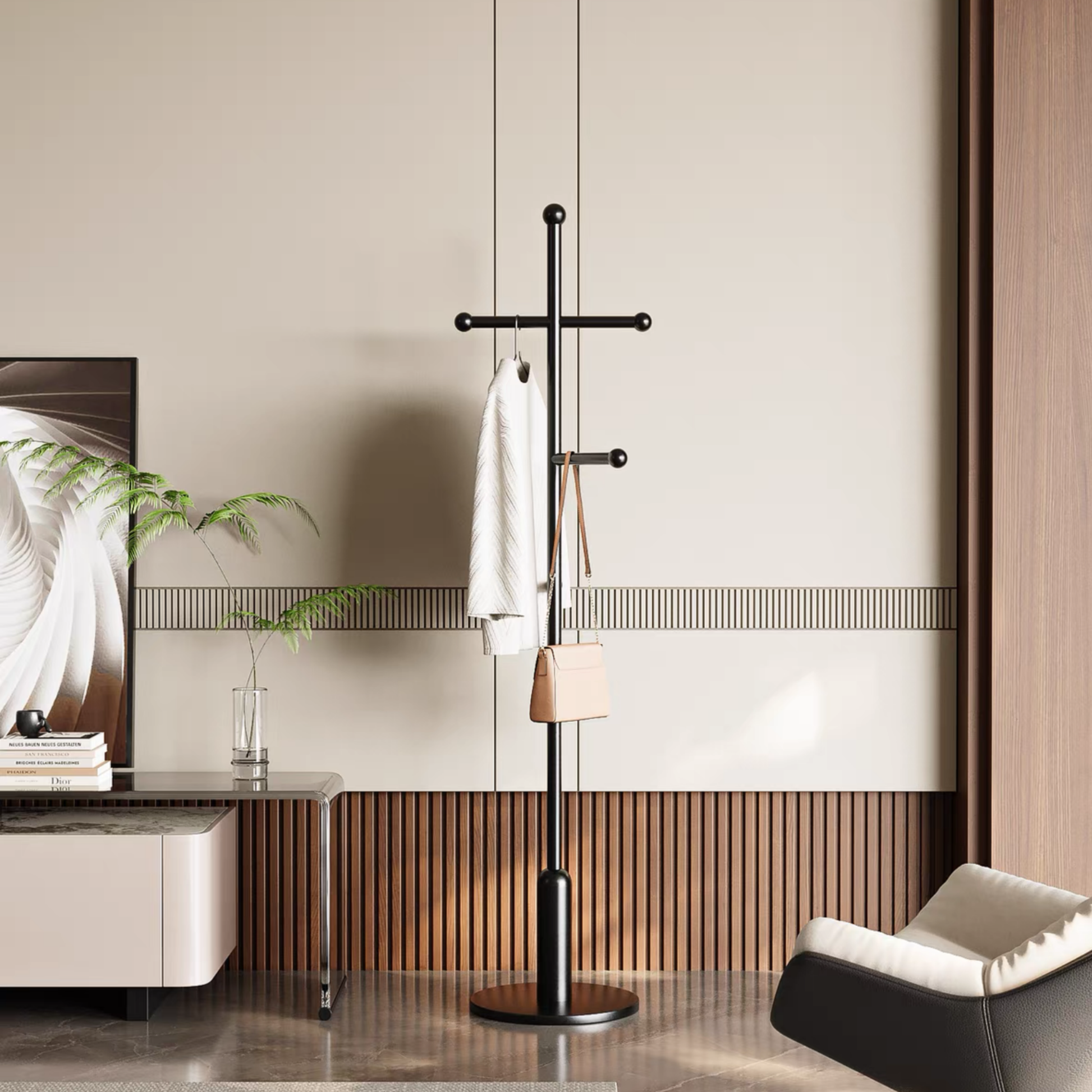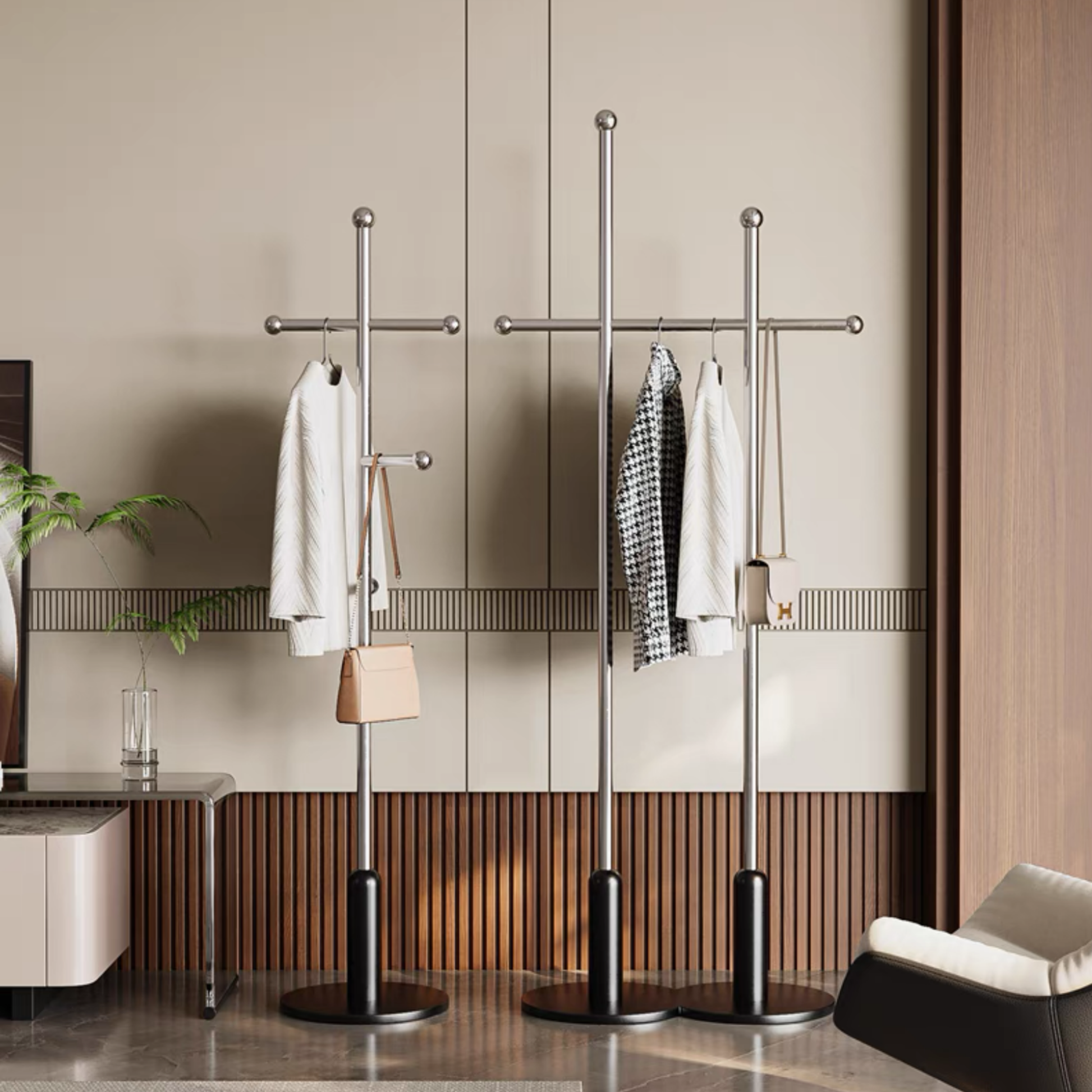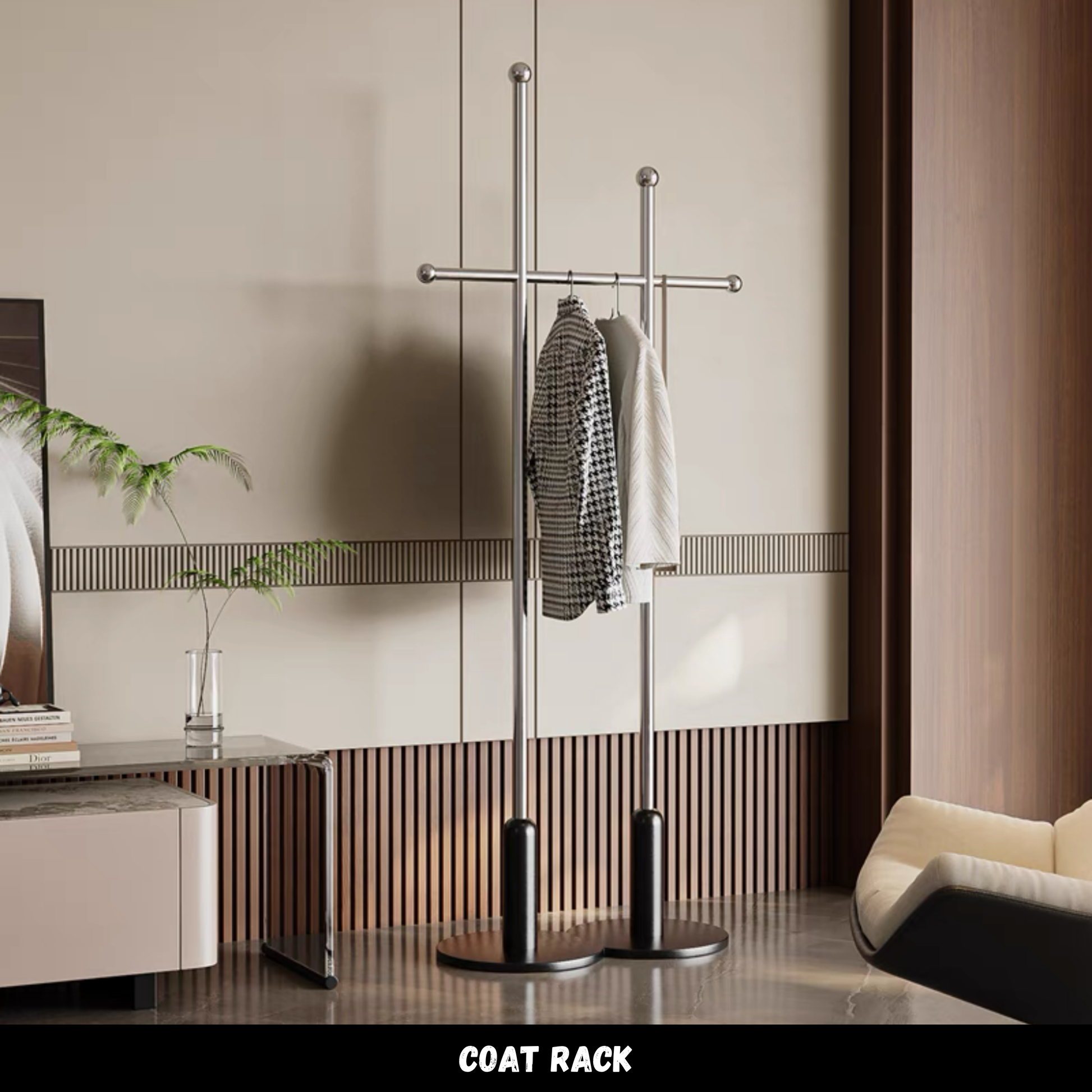 ราวแขวนผ้า RL056 modern double-pole stainless steel coat rack with a minimalist design. The rack features two vertical poles with a crossbar at the top for hanging coats and bags. Dimensions: 186cm tall, 65cm wide, and 35cm deep. The base consists of two round weighted platforms for stability, with a dark wood or black finish. The metal has a brushed or matte silver texture. Displayed with a jacket, coat, and handbag for scale. Studio lighting, white background, realistic rendering for product catalog ( สินค้ามี 2 size 40 และ 65 cm )