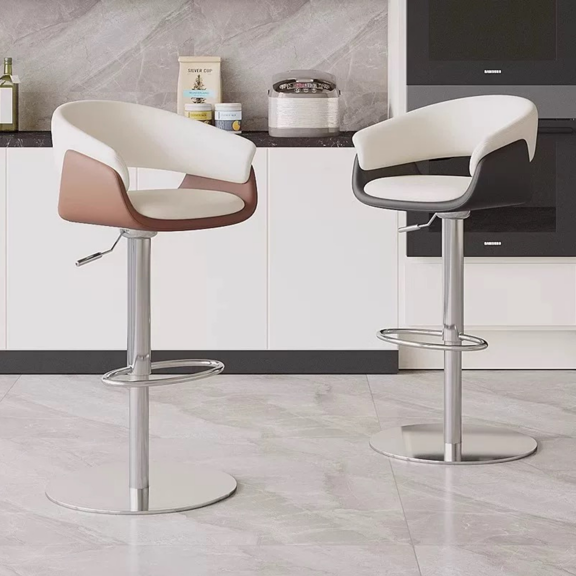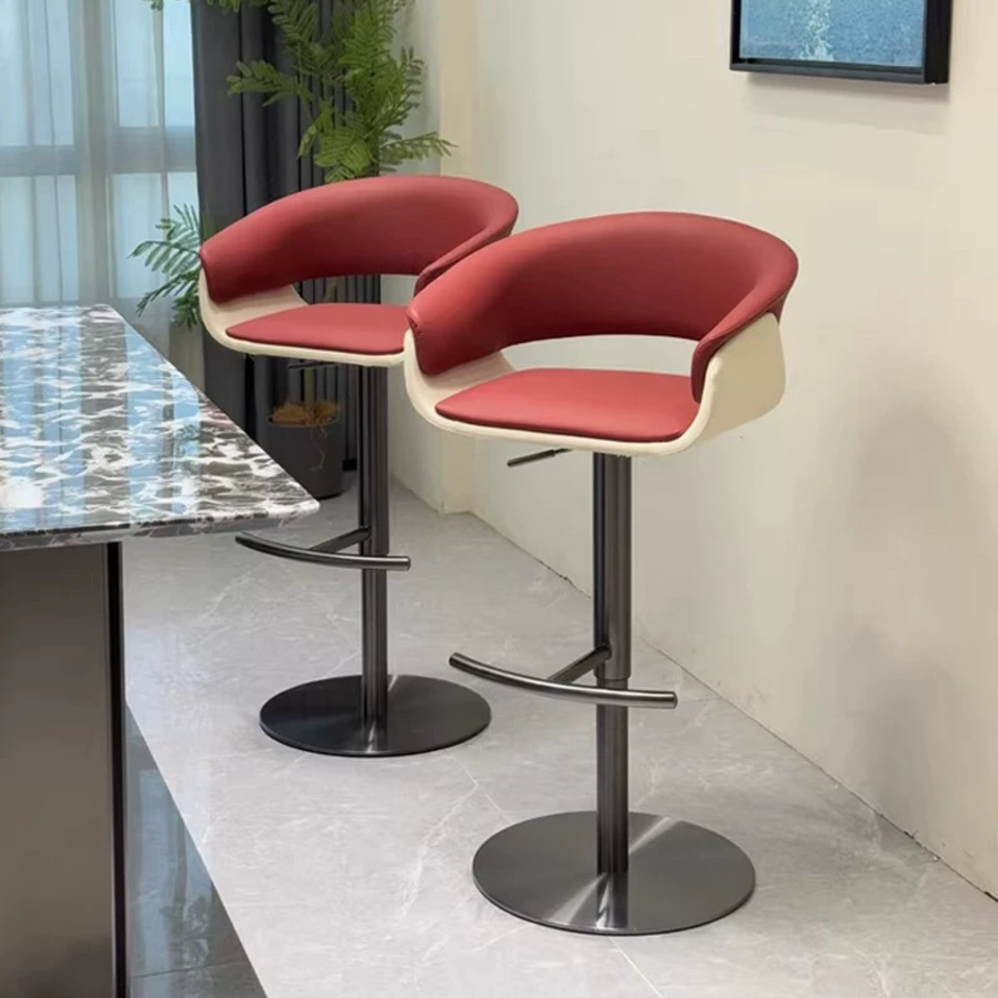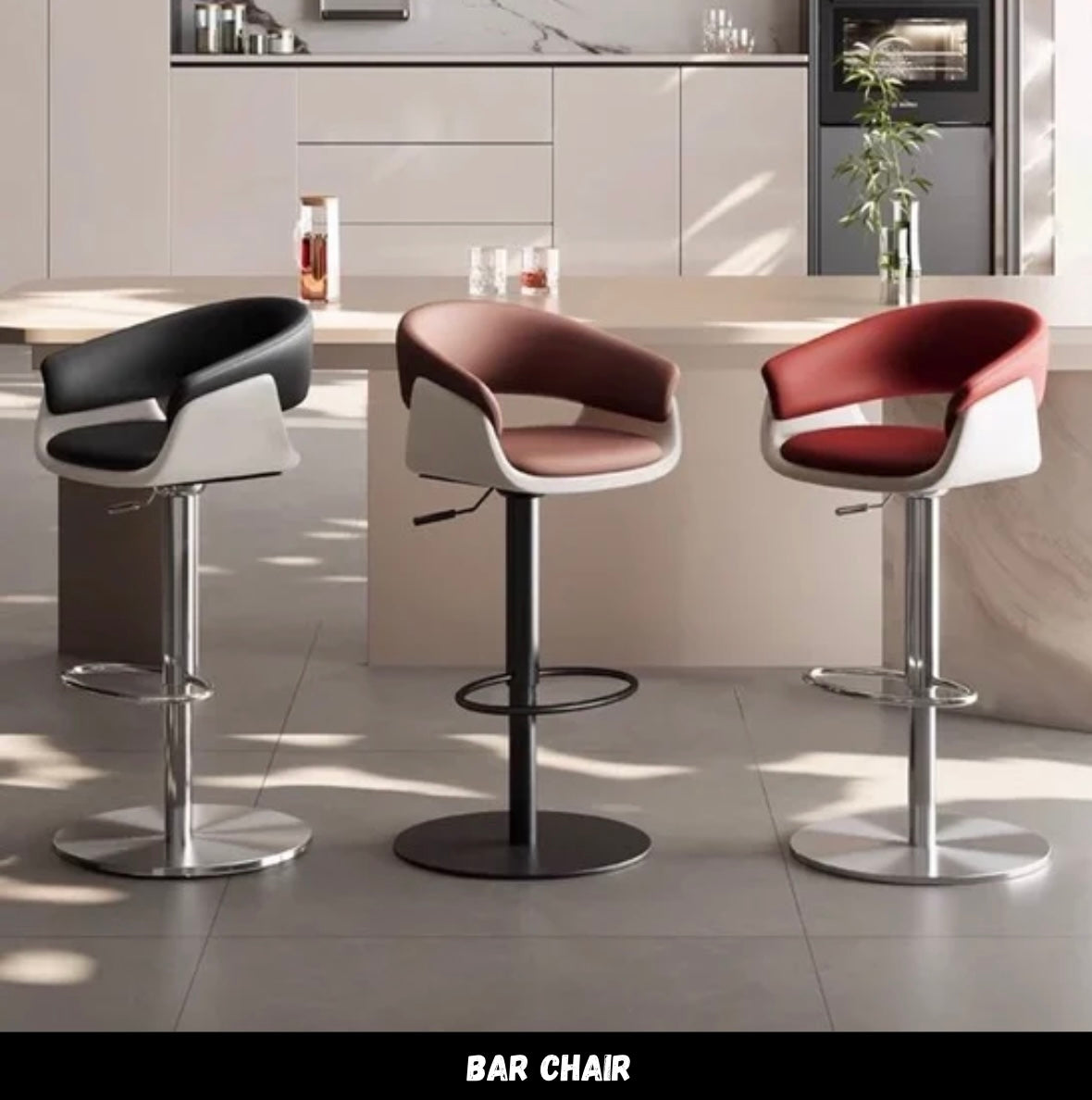เก้าอี้ ( CH0371 ) Stylish bar stool with leatherette cushion, swivel base, and adjustable height—perfect for kitchen islands or bar counters.