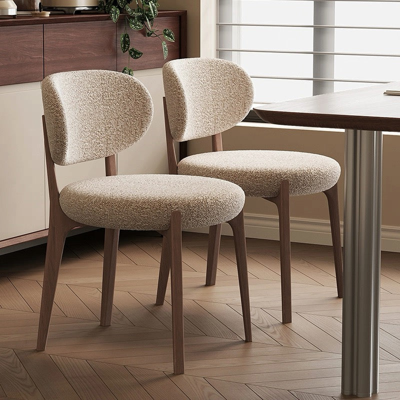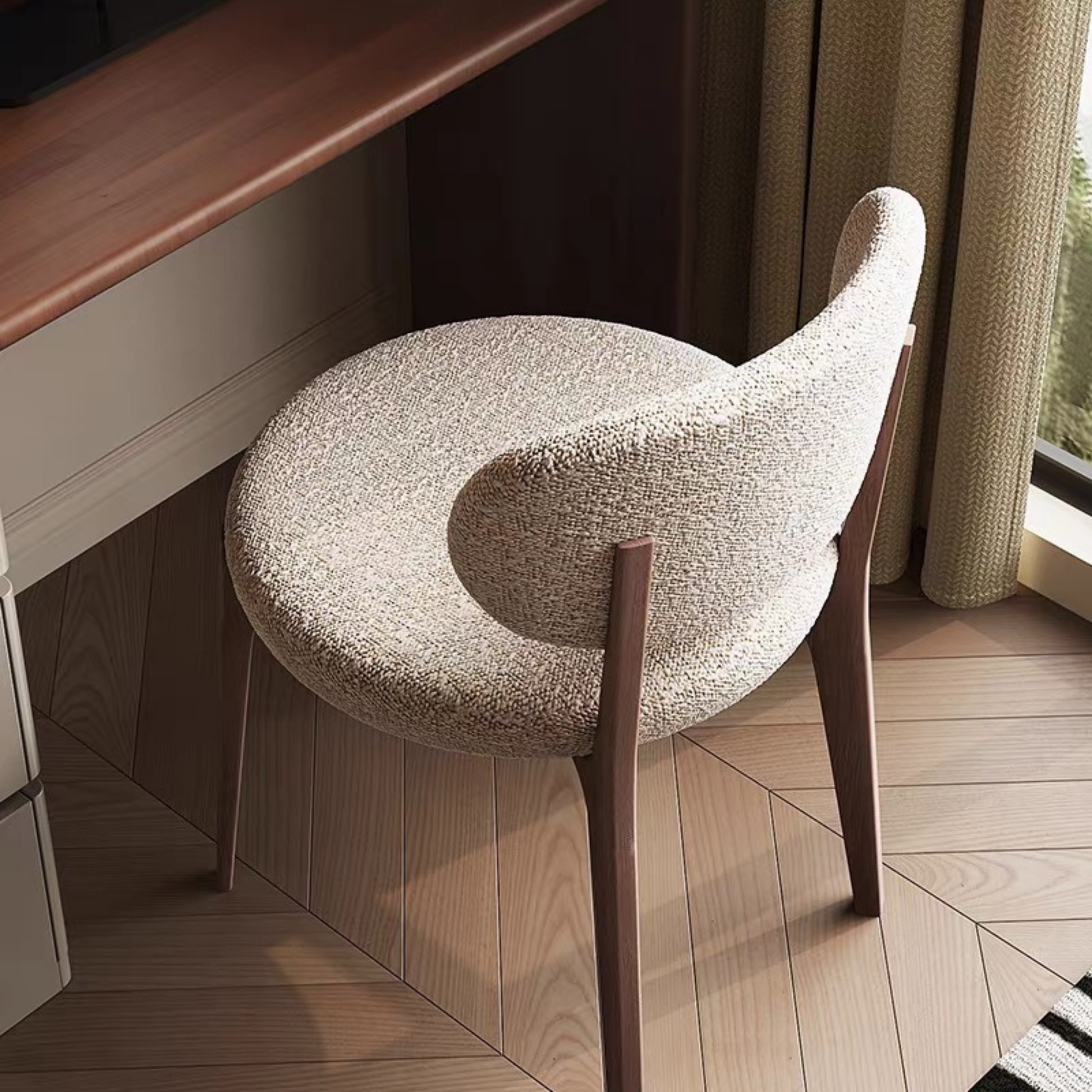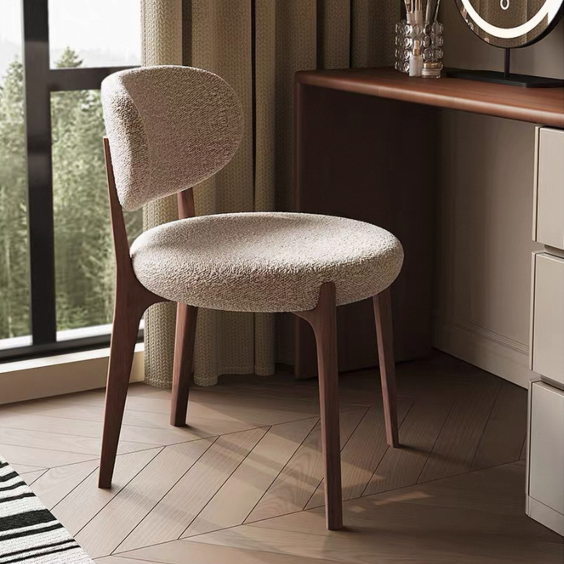 เก้าอี้ ( CH0348 ) Soft boucle texture meets warm walnut wood — creating a cozy yet sophisticated look Perfect for vanity, reading corner, or living space