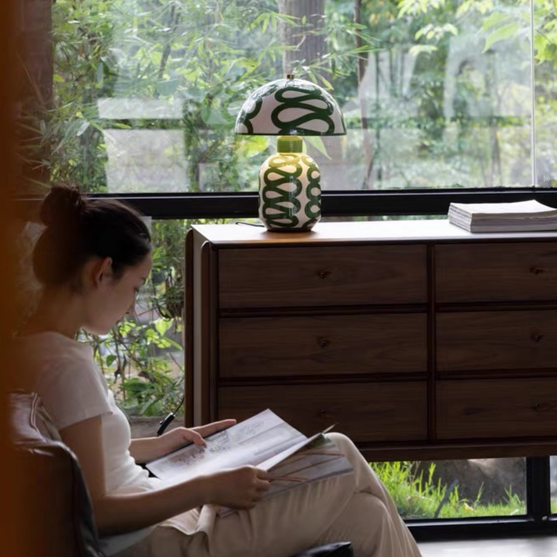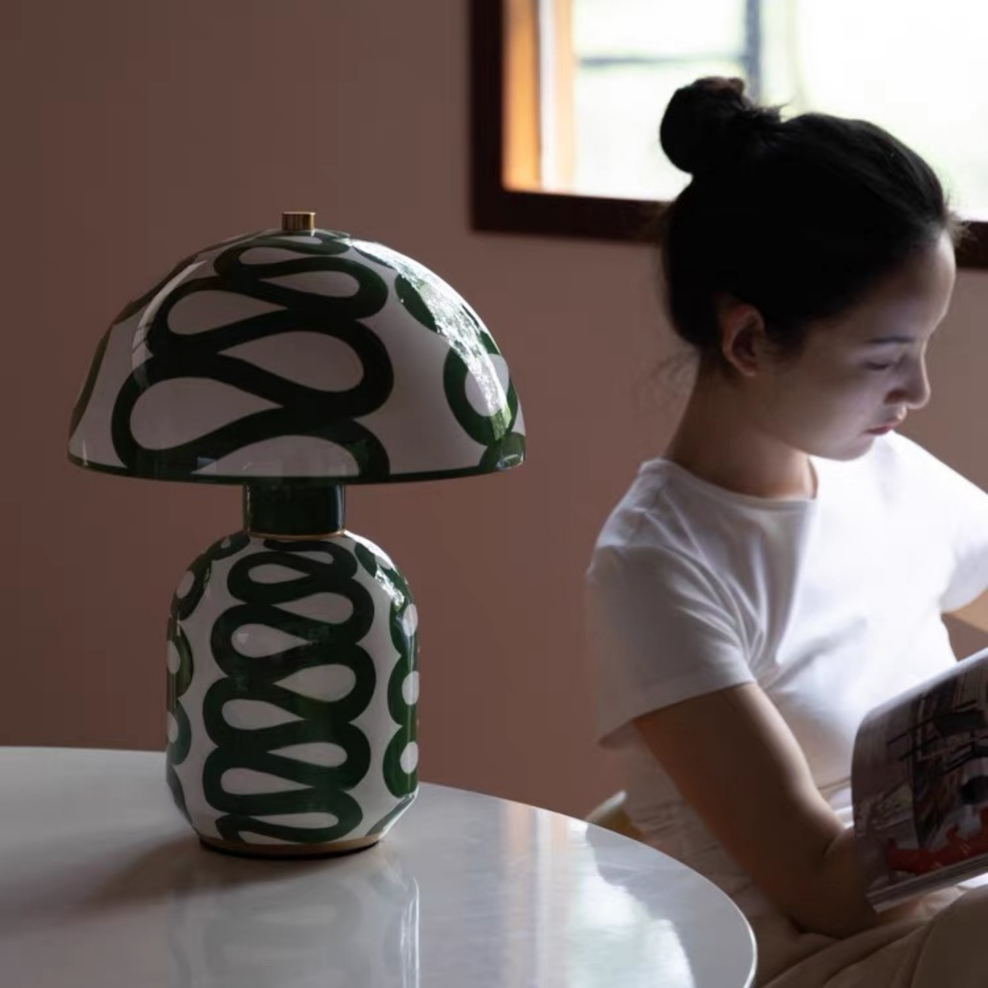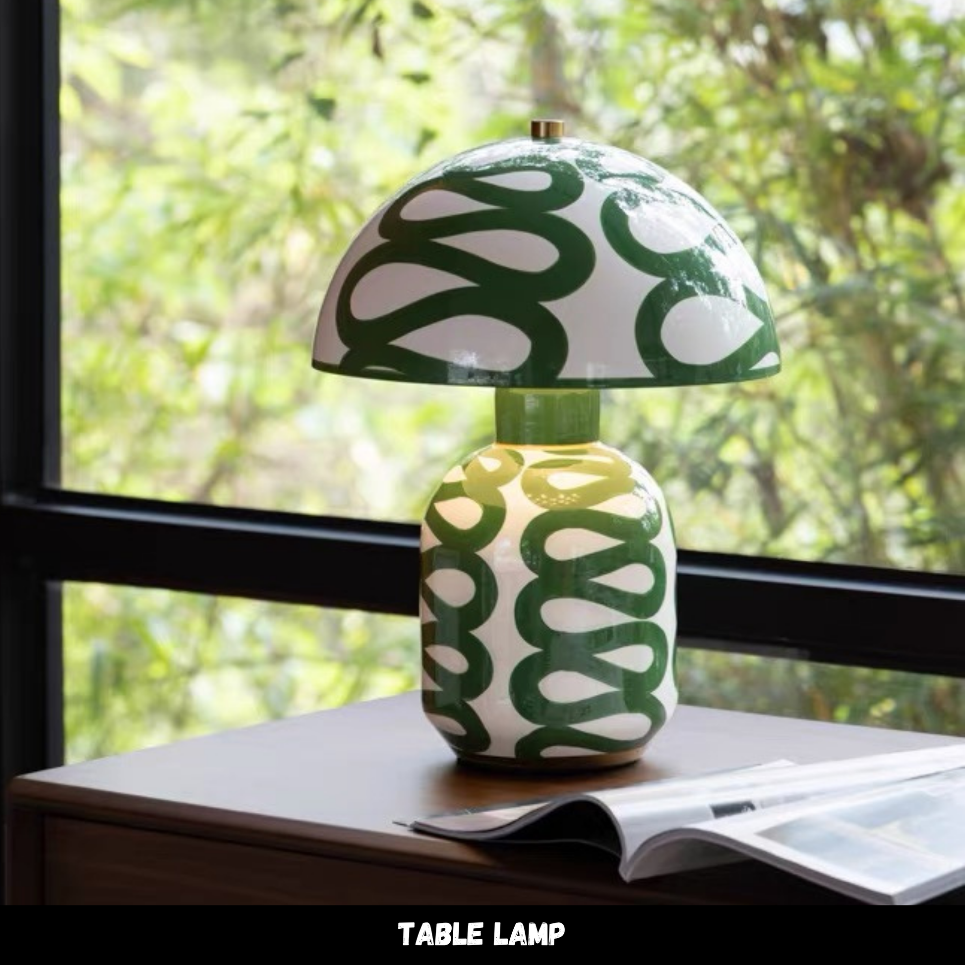 โคมไฟตั้งโต๊ะ ( LM076 ) vintage-inspired table lamp features a bold green-and-white graphic pattern, perfect for adding a playful yet stylish touch to your reading nook, desk, or creative studio. Crafted from quality ceramic with a soft, ambient glow