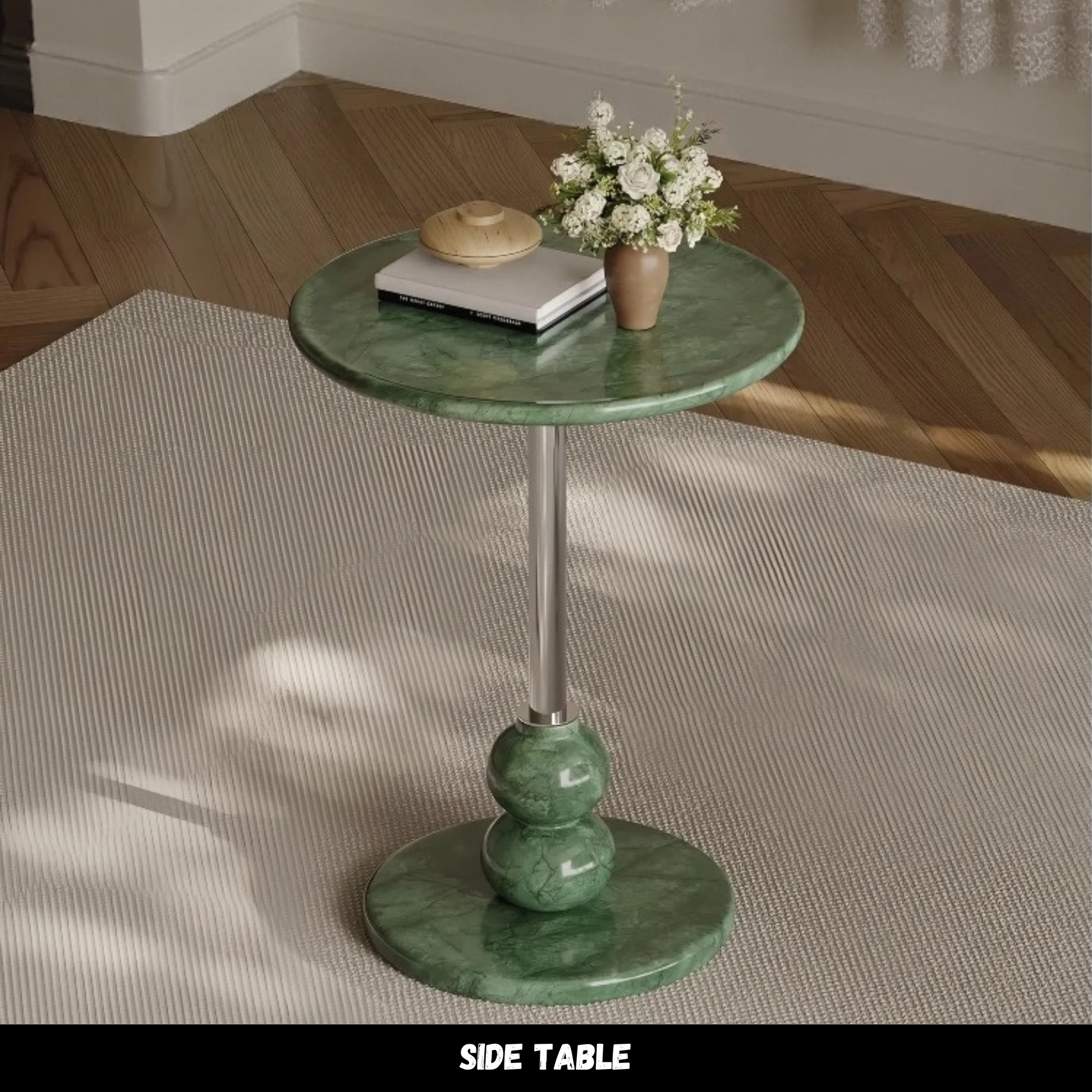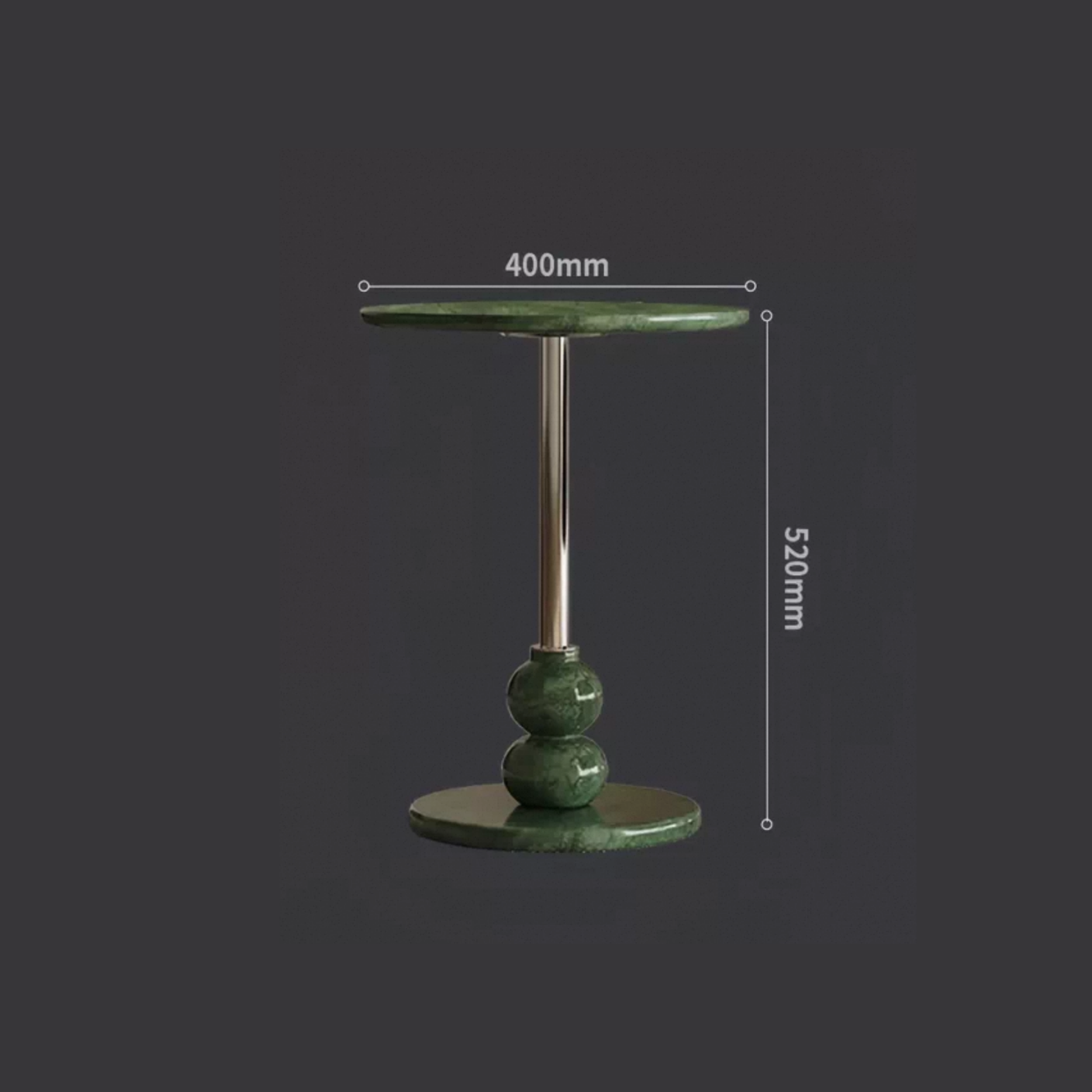 โต๊ะข้าง RL0177 striking side table featuring a polished Verde marble top and base, elegantly supported by a 304 stainless steel rod. This piece combines luxurious materials with modern minimalism—perfect as an accent table in any sophisticated living space
